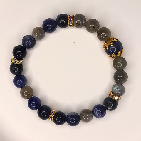 - la labradorite (taille 8 mm) qui stimule la capacité à ressentir des émotions profondes tout en gardant une vision réaliste des choses,