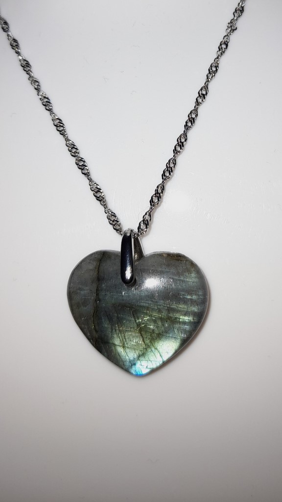 Taille du pendentif monté sur du métal couleur argent : environ hauteur 2,7 cm et largeur 2,5 cm.Ce pendentif permet de mieux gérer ses émotions profondes grâce à la labradorite.