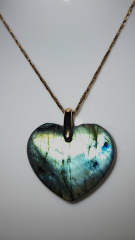 Taille du pendentif monté sur du métal couleur or : environ hauteur 2,7 cm et largeur 2,5 cm.Ce pendentif permet de mieux gérer ses émotions profondes grâce à la labradorite.